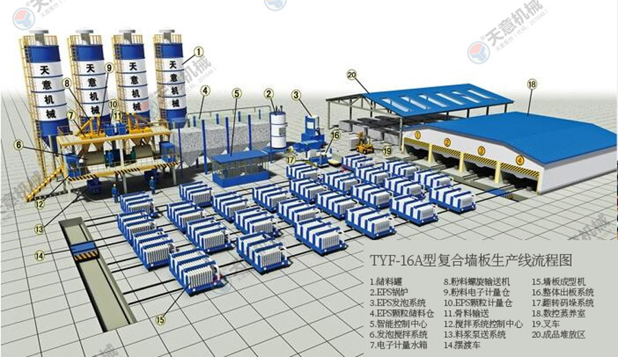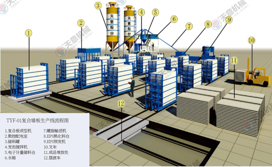 TY12型墻板生產(chǎn)線(xiàn)包括:墻板成型機、整體穿抽管系統、發(fā)泡系統、水箱、電子計量?jì)α蟼}、螺旋上料輸送機、儲料罐、螺旋輸送機、EPS熟化料倉、硫化干燥床、EPS預發(fā)機、數控配電室、發(fā)泡攪拌機、整體出板系統、叉車(chē)、成品堆放區、擺渡車(chē)。
