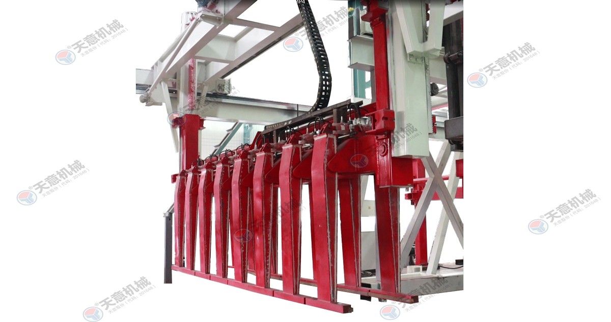 成品分垛吊機:將蒸養車(chē)上的一模坯體吊運至掰板輸送機上,然后將空側板吊運至蒸養車(chē)上;切割工段空翻脫模機將??蚍D90°,放在切割小車(chē)支座上進(jìn)行脫模,脫模后的??蚺c清理后的側模板進(jìn)行合模,合膜后的空??虮坏?..