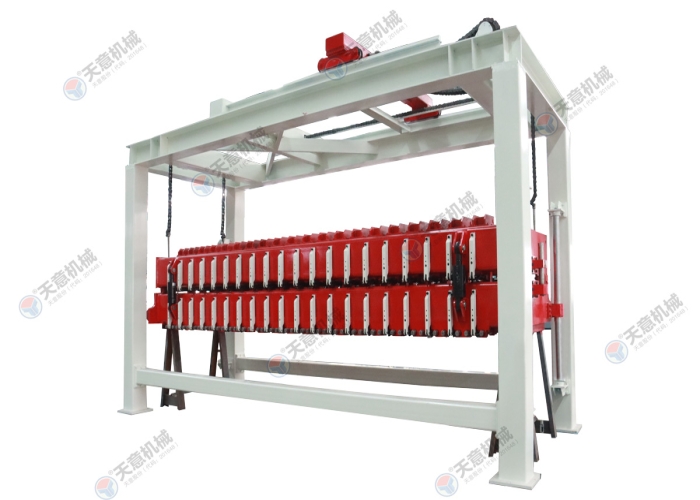 脫模后的坯體連同側板一起放置在切割小車(chē)上,切割小車(chē)由減速電機驅動(dòng)行走,通過(guò)縱向切割機完成縱向切割,切割小車(chē)繼續行走至橫向 切割機中間位置停止后,由小車(chē)置換裝置將側板連同坯體抬起,切割小車(chē)退回翻轉行車(chē)底下進(jìn)行下一次承載脫模后的坯體,另外一部切割小車(chē) 進(jìn)入置換裝置底下后, 置換裝置將側板連同坯體放置該切割小車(chē)上后,橫向切割動(dòng)作后啟動(dòng)進(jìn)行橫向切割動(dòng)作,切割完成后,切割小車(chē)再行走至確地行車(chē)底下,再由 翻轉去底行車(chē)將坯體去底(連側板)吊至蒸養小車(chē)上,切割小車(chē)范圍原始位置進(jìn)行下一個(gè)切割循環(huán)。
