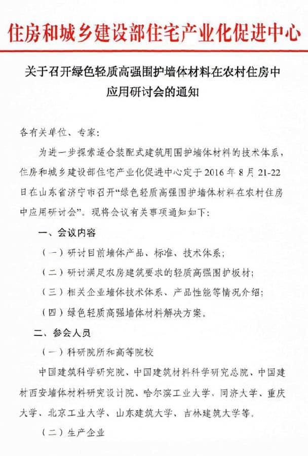 為進(jìn)一步探索適合裝配式建筑用圍護墻體材料的技術(shù)體系,住房和城鄉建設部住宅產(chǎn)業(yè)化促進(jìn)中心定于2016年8月21-22日在山東濟寧市兗州區召開(kāi)“綠色輕質(zhì)高強圍護墻體材料在農村住房中應用研討會(huì )”。