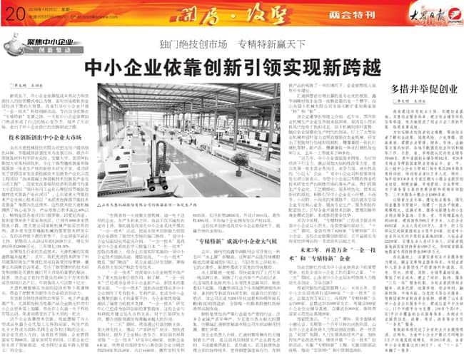 2015年1月25日的大眾日報?兩會(huì )特刊《獨門(mén)絕技創(chuàng )市場(chǎng) 專(zhuān)精特新贏(yíng)天下――中小企業(yè)依靠創(chuàng )新引領(lǐng)實(shí)現新跨越》重點(diǎn)介紹了我公司技術(shù)創(chuàng )新的經(jīng)驗,敬請關(guān)注。